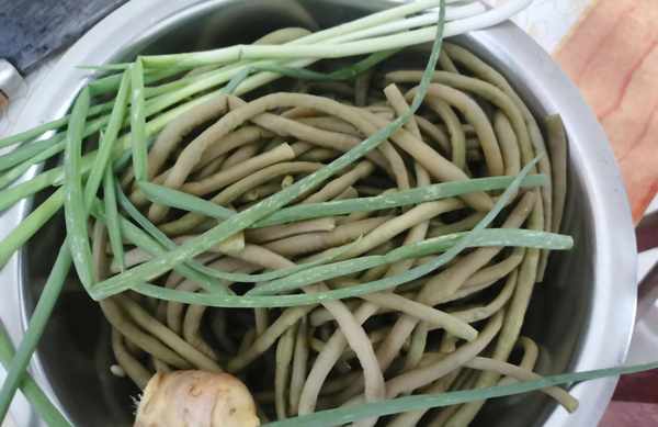 2,摘回來的豆角用清水清洗幹凈,摘掉頭尾,然後掰成兩段。鍋裡加水燒開,然後把豆角放到鍋裡焯熟。焯好的豆角過涼水,放一邊備用。