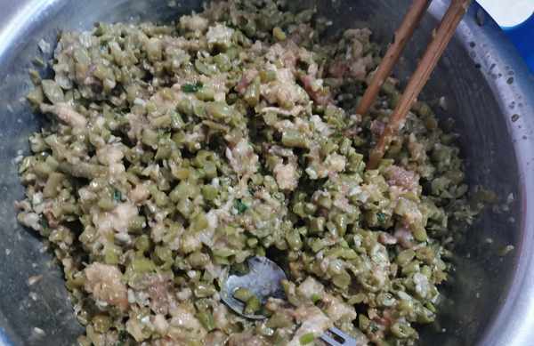 4,肉餡剁好之後,把豆角切成碎末放在一起,接著加適量的生抽,胡椒粉,鹽,味精調味,然後用筷子攪拌一下。
