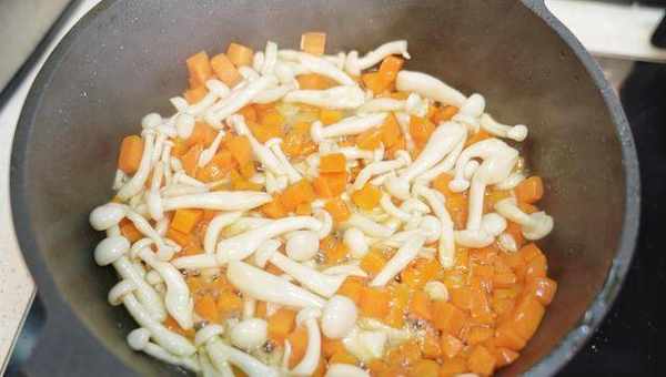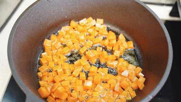 5、鍋裡熱油後放入切成小方粒的胡蘿卜翻炒出香味
