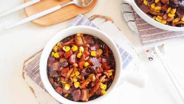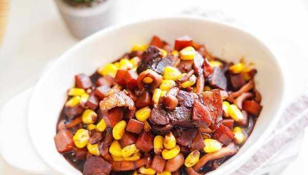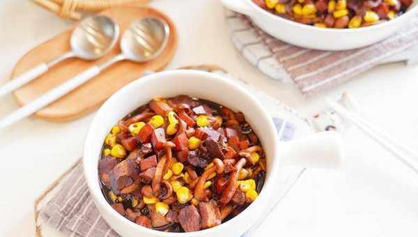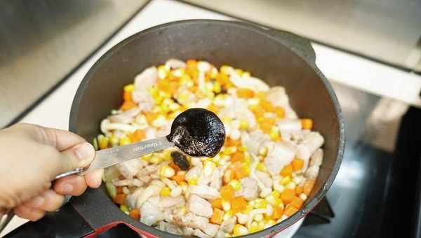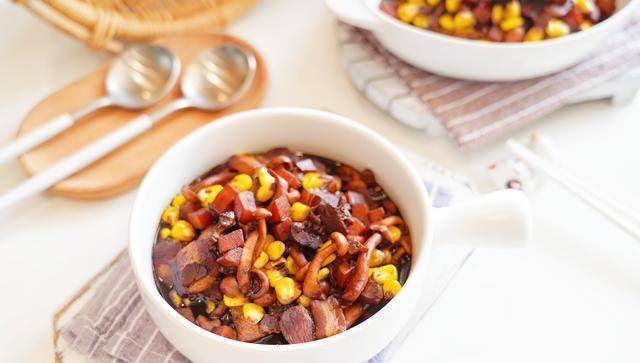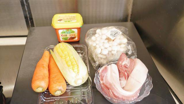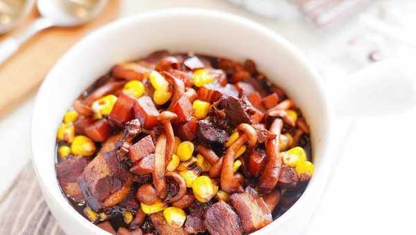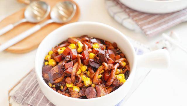 【彩蔬菌菇醬五花】五花肉300克,甜玉米1根,胡蘿卜2個,蟹味菇150克,薑1塊,甜面醬45克,開水1杯,植物油30毫升