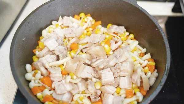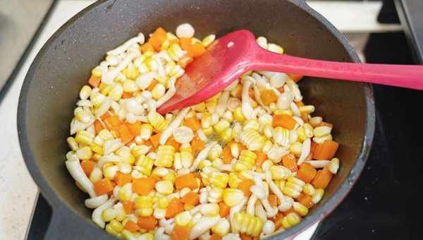7、放入剝好的甜玉米粒翻炒至甜玉米變色