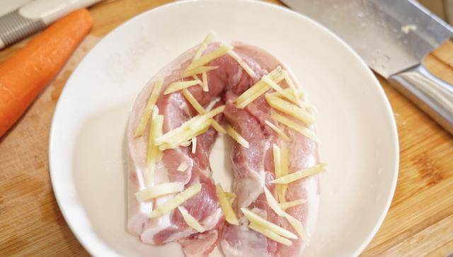 2、五花肉用清水沖洗後放入盤裡,在五花肉上均勻地鋪上薑絲