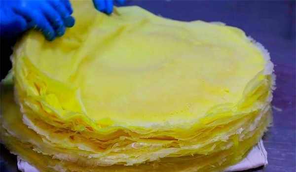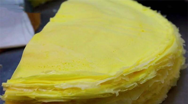調好的雞蛋液倒入電煎鍋中,端起鍋把蛋液均勻的攤平在鍋底,待蛋液受熱成蛋皮後取出,黃橙橙的散發著淡淡的雞蛋液香氣,一分鐘可以攤2張左右,做好的蛋皮對半切成2半,忙的時候要3個人同時攤面皮。