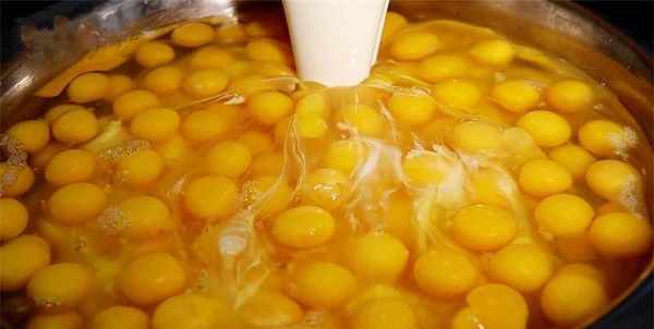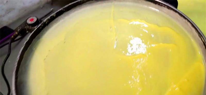 大姐傢做的卷圈皮跟市面上的有挺大的差異,她傢用的都是當天從雞場撿出來送過來的新鮮雞蛋,打入盆中,再用打蛋器打成均勻的蛋液,再加入適量的淀粉、清水攪拌均勻,三者的比例很有一定的講究,比例一定要好,調不好的話這個雞蛋皮就攤不成形。