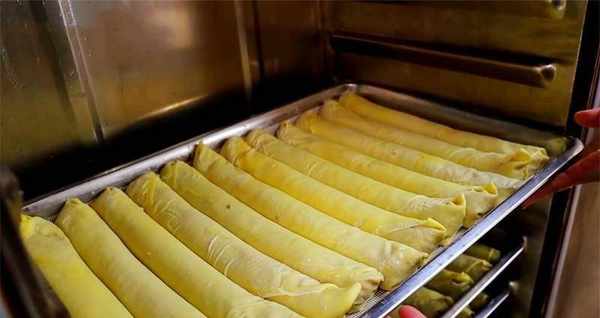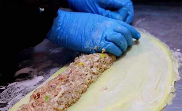把面皮鋪開,在上面抹上面糊,然後把醃制好的肉餡捏成條狀,放置到面皮的一側,然後用面皮把整個肉餡完全地包裹起來,放置到蒸盤裡,黃橙橙的看著都非常的誘人,大姐說這樣的一條蒸出來有8兩左右,因為常年操作,完全不用稱就知道放置的肉餡的分量,做好的卷尖放入蒸爐中,上汽後大火蒸50分鐘左右出鍋。