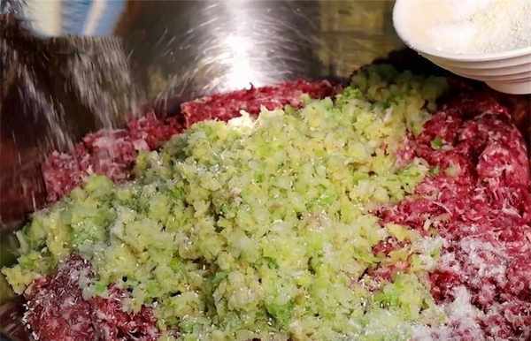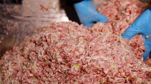 卷尖裡邊的肉餡也都是當天采買的新鮮豬肉,肥瘦相間打成肉末,加入蒜末、食鹽和雞精,然後用手攪拌均勻備用,把紅薯淀粉加水攪拌均勻,調成稍微帶絲的漿料,然後倒入攪拌好的肉餡中,繼續攪拌均勻,讓肉餡都裹上紅薯淀粉漿,攪拌成肉餡跟淀粉漿帶著粘稠狀就可以瞭。
