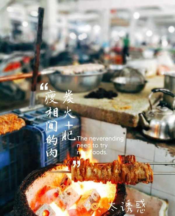 將充分吸收湯汁的瘦肉和肥肉相間串好,然後用去皮的甘蔗夾緊,再放置木炭爐上烤制,經過烤制,肉片上的豬油包裹著肉片,再加上甘蔗的清甜氣質,吃起來唇齒留油,非常的香。