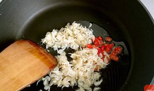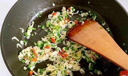 6.鍋中放油,把小米椒和蝦皮放下去爆香。