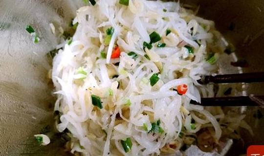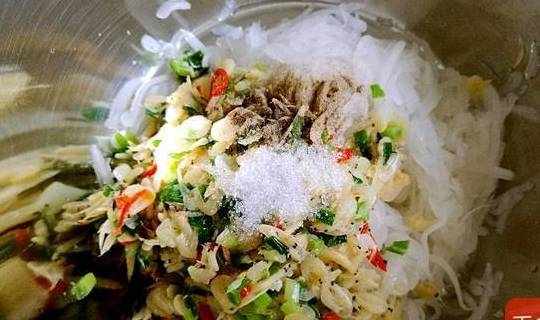 8.炒好的料放入蘿卜絲盆中,放入白糖,胡椒粉,根據之前的咸度決定要不要加鹽。