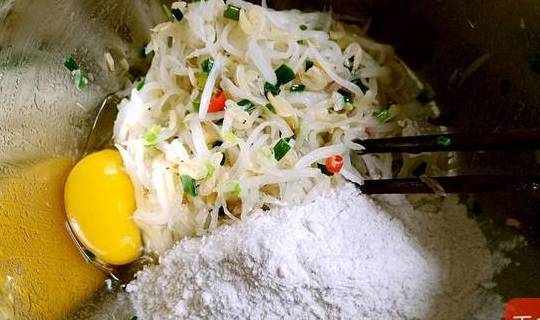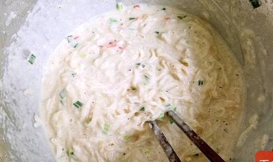11.把面粉和蘿卜絲攪拌均勻,邊攪拌邊加入水,一點一點的加,視情況加。