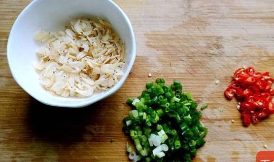 5.蝦皮用水洗凈,小米椒剁碎,小蔥切未。