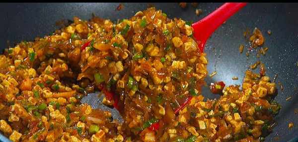 步驟五:鍋中留油,把蒜末炒香,再加一勺豆瓣醬,炒出紅油,加入豆腐丁、粉條碎、鹽、五香粉、雞精、一勺生抽、蔥花,翻炒均勻,餡料就調好瞭,盛出放涼備用。