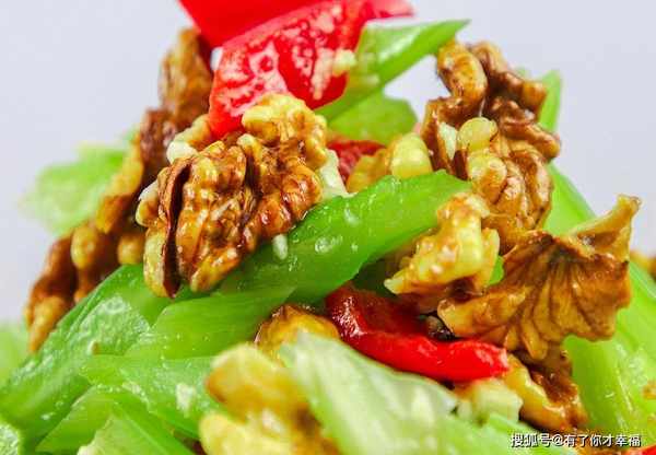 4.準備一個大盆,倒入切好的蒜末,加入食鹽2克、味精1克、白醋3克、香油5克,把控幹水分的芹菜和紅椒倒入盆中,顛盆拌勻,倒入核桃仁再次拌勻後即可裝盤,美味即成。