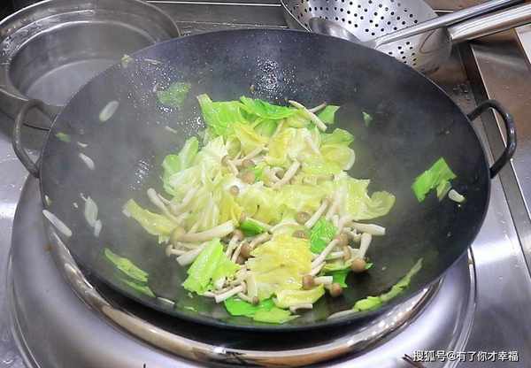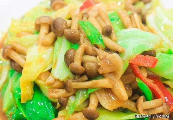 2.鍋內燒油,油溫五成熱時,倒入蒜片煸炒出香味,放入瀝幹水分的包菜,開中火爆炒30秒鐘,爆炒微微塌軟返青以後,倒入蟹味菇繼續翻炒1分鐘,把蟹味菇中的水分炒出來。