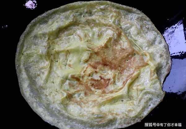 3.鍋內燒油,充分滑鍋,燒熱以後倒出熱油,直接倒入一半雞蛋液,輕輕轉動鍋,利用餘溫把雞蛋液鋪成圓形的雞蛋餅,定型以後沿著鍋邊淋一圈植物油,淋植物油能使蛋餅脫離。