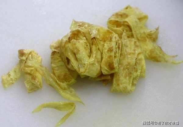 4.雞蛋餅周圍翹起時翻面,把另一面也煎黃煎定型即可出鍋,把煎好的蛋餅疊起來,切成寬條備用。