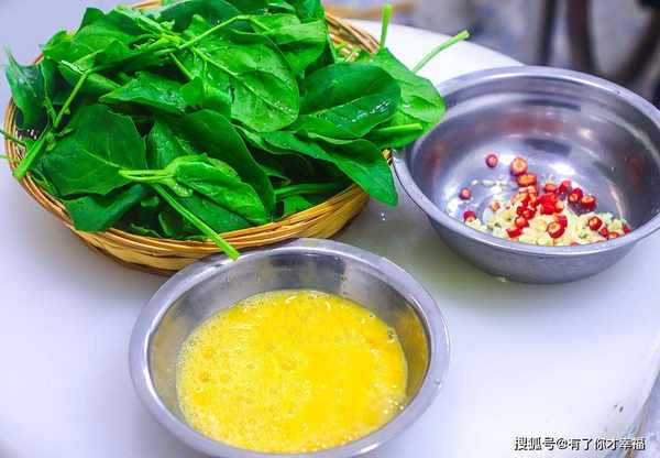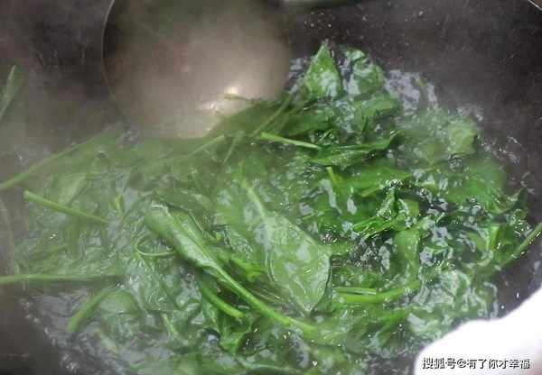 2.鍋內燒水,加入少許食鹽和植物油,讓菠菜色澤更加鮮亮,防止營養流失,水燒開以後放入洗凈的菠菜,焯水能夠減少菠菜中的草酸,菠菜斷生後倒出來,用清水沖洗,冷卻控水。