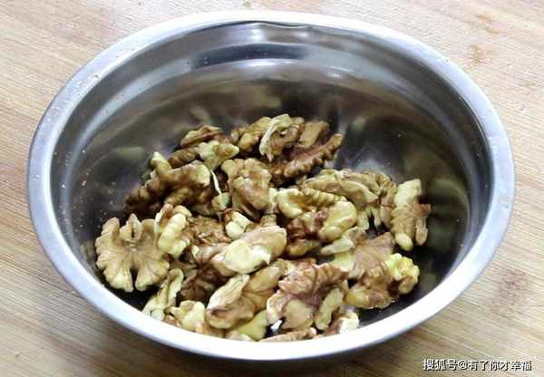 2.準備核桃200克,把核桃仁剝出來備用。大蒜幾粒,拍散後切成蒜末。