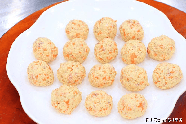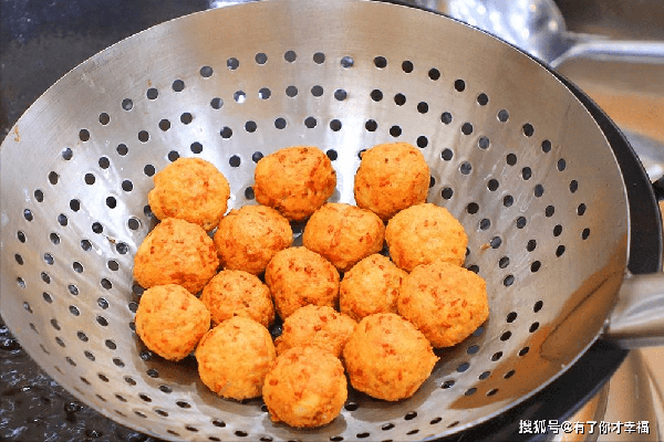 4.鍋內燒油,油溫五成熱時,把丸子輕輕地放入鍋中,保持小火慢慢炸,丸子炸焦、炸成金黃色時撈出來控油。