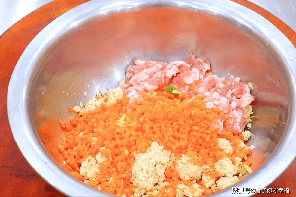 1.準備一塊老豆腐,用刀背壓碎放在棉佈裡面,使勁擠壓出裡面的水分。五花肉一塊,去除肉皮,先切成薄片再剁成肉粒。半根胡蘿卜,切成碎粒,和豆腐放在一起備用。
