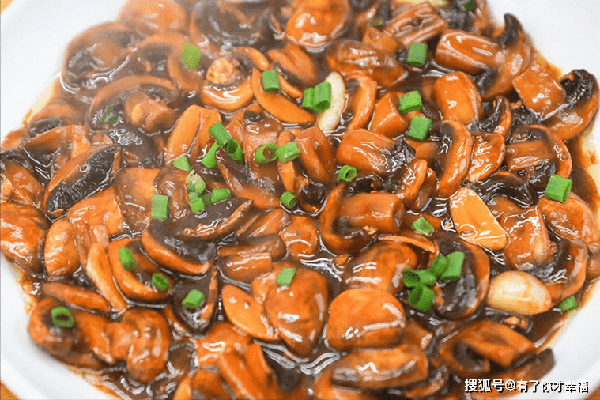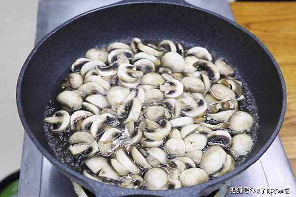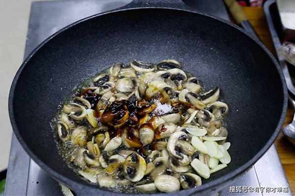 3.鍋內燒油,放入蒜片爆香,把口蘑倒入鍋中,開大火爆出香味,加入蠔油,老抽上色,生抽,味精調味。