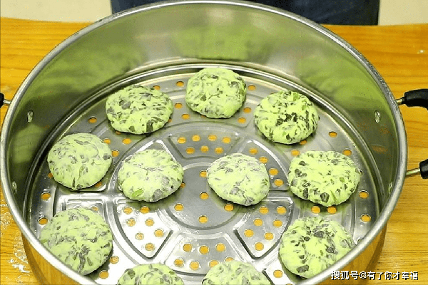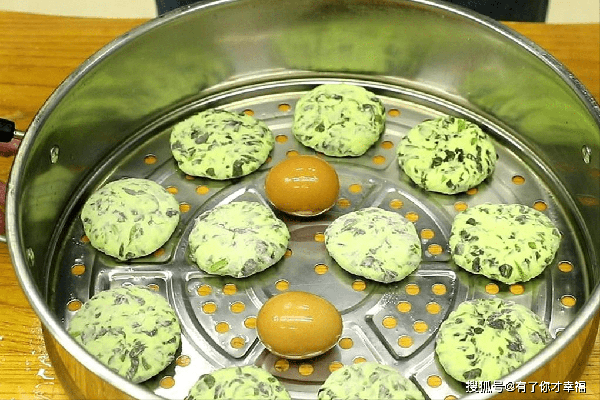 3.篦子上刷上一層油防止粘連,把餅坯一個一個放進去,中間稍微留點縫隙,防止蒸熟以後粘在一起,再放入兩個雞蛋,等會兒用來調醬用,水燒開以後大火蒸15分鐘即可。