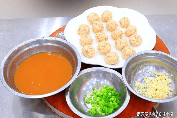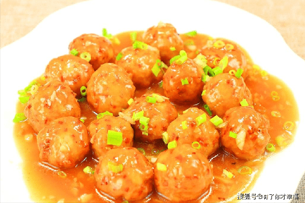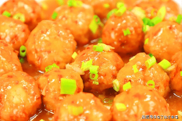 5.鍋內留底油,放入蒜末煸炒一會兒,聞到蒜香味以後,把碗料倒入鍋中攪拌均勻,料汁燒開以後倒入炸好的丸子,丸子均勻裹滿料汁以後即可出鍋,最後撒上蔥花,一道金黃軟糯的豆腐肉丸就做好瞭。