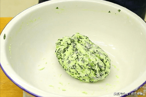 1.準備適量的菠菜,擇洗幹凈後切去根部,切成碎段放入盆中,加入適量的食鹽、油,反復抓揉出裡面的水分,多次少量的倒入面粉,和成一個柔軟的面團,全程不要加水。
