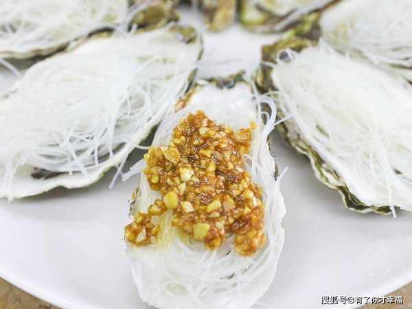 3.把生蠔擺放在盤中,粉絲纏成結,放在生蠔上面,再鋪一層蒜蓉醬,就能準備蒸制瞭。