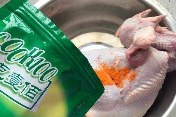 2、準備幾根牙簽,用來在雞身上紮小孔,盡量反復多紮幾次,這樣才能更方面去入味。然後把奧爾良的料撒在上面,用手將它們抹勻。