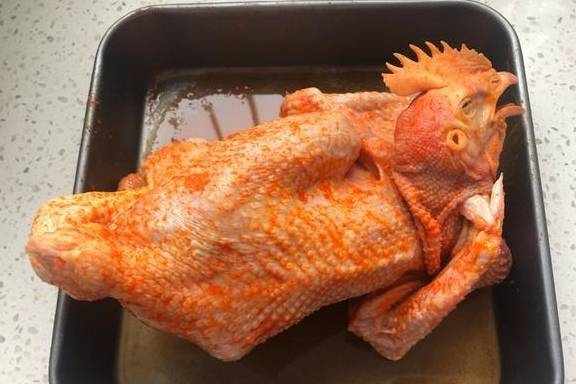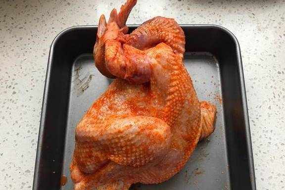 3、抹勻之後要為它們做個按摩,輕輕地去揉搓,讓料可以完全地塗抹在雞的身上。這個步驟要帶上一次性的手套。確定抹勻瞭之後就將它密封放到冰箱裡。需要冷藏24小時。中間要取出兩次再按摩一下。如果嫌時間太久可以在雞的身上劃幾刀,入味更快。