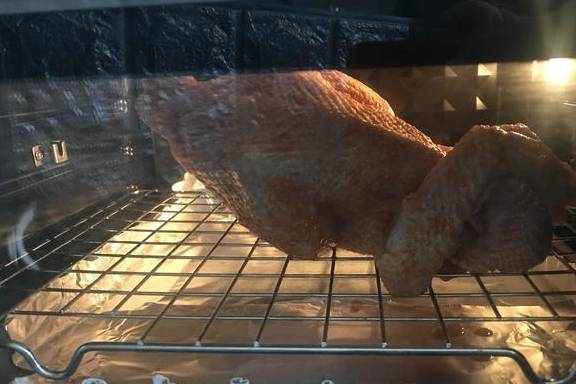 5、把烤箱預熱,上下管都是200度。然後把雞放進去烘烤,這個過程需要40分鐘。預熱十分鐘之後,把烤網放在中下層,烤雞放在中間。可以在烤網下面放上一個烤盤,這樣方便接烤出來的油脂。