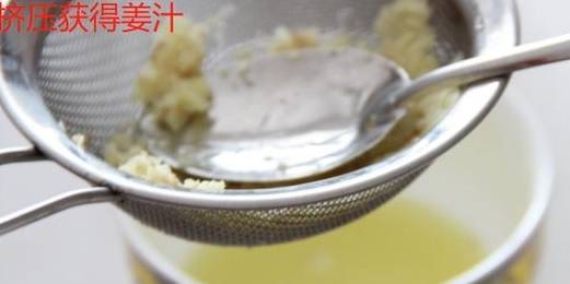 把生薑去皮搗碎,然後用細紗佈包住薑蓉或者是用篩網加湯匙擠壓,底下用一個碗接著擠出來的薑汁。如果傢裡有榨汁機或者料理機就不用這麼麻煩瞭,薑汁擠出來之後可以用保鮮膜先把碗封上。