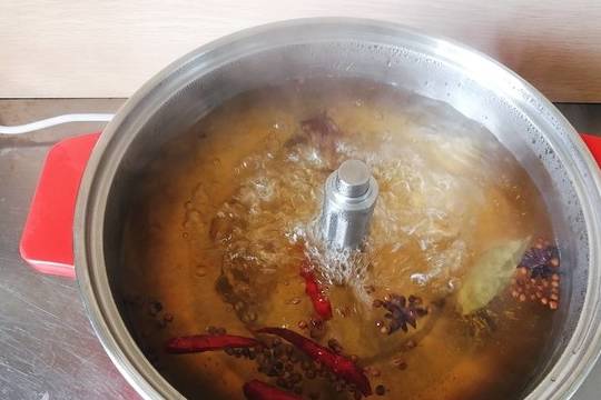 3.取出鍋裡的升降盤,放水,尖辣椒,八角花椒,香葉和桂皮,老抽,生抽,燒開