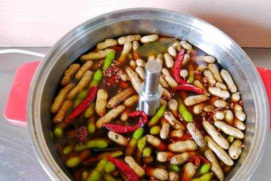 5.讓花生和毛豆浸泡在佐料湯汁裡,中火燒開繼續煮20分鐘