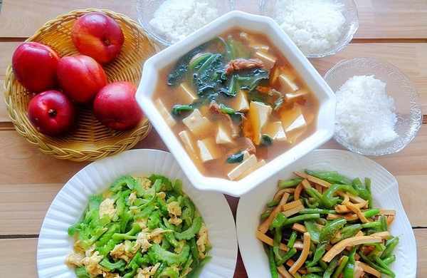 菜:苦瓜炒雞蛋+蒜薹炒香幹+肉絲豆腐湯