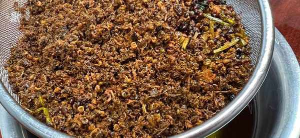 6、第二天,找個漏網把花椒油過濾出來,漏勺裡的花椒碎不要扔掉,炒菜時加點可以提香,或者曬幹搗碎,就變成花椒粉瞭,一種食材多種吃法。