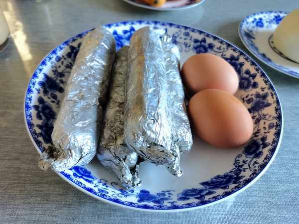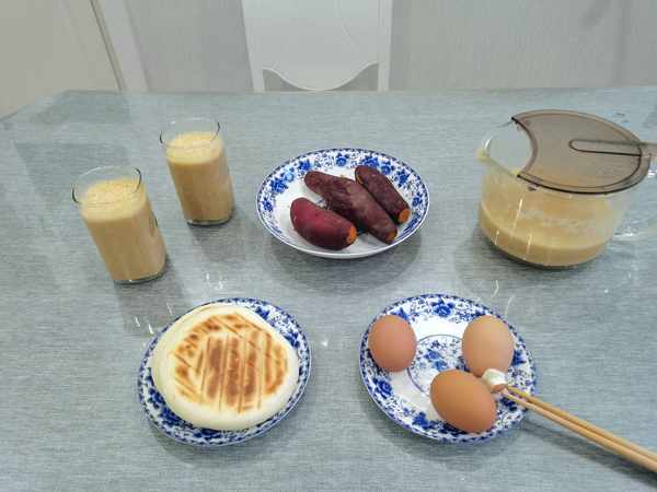 煮雞蛋,白吉饃,蒸紅薯,黃豆小米紅棗枸杞豆漿。