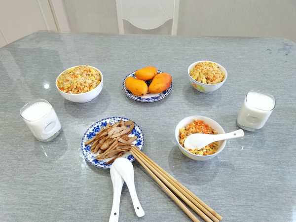 晚上預約米飯,早晨用熱米飯做炒米飯,五香豆幹放烤箱烤5分鐘,切條裝盤,微波爐加熱牛奶。全程不到10分鐘就上桌,