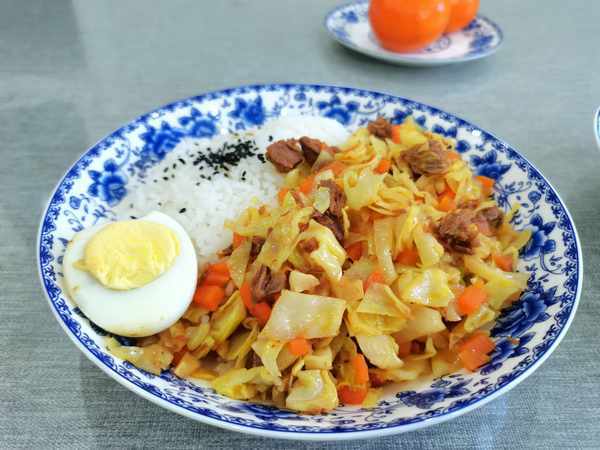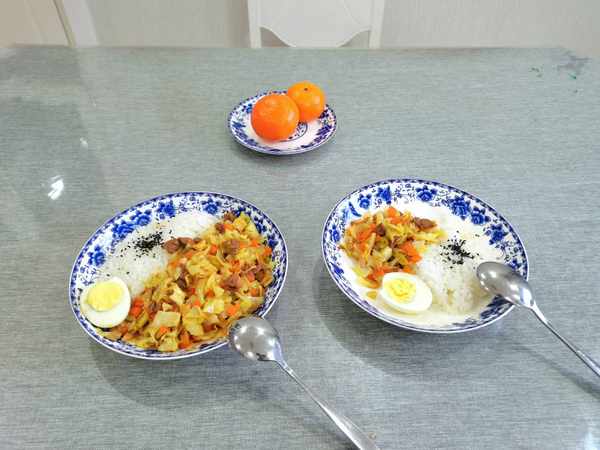 晚上預約好米飯,準備好熟牛肉和要用的蔬菜,早晨起床煮雞蛋,把牛肉和蔬菜切丁,放鍋裡炒熟,把米飯盛盤子裡面,澆上牛肉蔬菜就好。