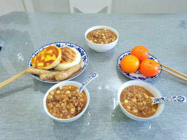 玉米蓮藕牛肉粥,蒸鐵棍山藥,發面烙餅,水果是沃柑。