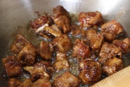 第三步,加上少許的清水,調成稀稠適中的面糊,醃制好的排骨,一塊一塊放入在面糊中,均勻的沾裹上面糊,在鍋中添上油,待油燒熱後,將沾裹面糊的排骨放入鍋中;
