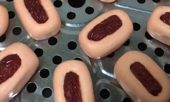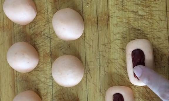 第三步。劑子切好後先用手揉成一個個小圓球,然後再用手給它揉成一個個的圓潤的長方形。我們要提前準備好紅棗,洗凈去掉核,對半切開,取出一半紅棗,將它倒扣到面團上,用手稍稍按壓一下。
