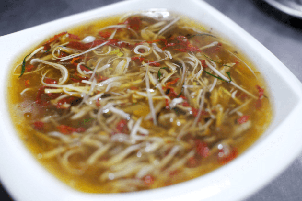 起鍋熱油,辣椒絲、蒜末、薑末熗鍋,下入當地農傢釀的麥麩醋。再倒入高湯,肚絲入鍋,撇浮沫。依次把蛋皮絲、木耳絲、玉蘭片下鍋,胡椒、鹽調味,老抽調色,再入菠菜絲,少許醋再次調和酸辣比例。流水芡少量多次將湯汁調至濃稠。出鍋前,撒蒜末,咸香味道融合瞭蒜香。至此,一碗“鮮、酸、咸、辣”的秦安酸辣肚絲湯才宣告完成。
