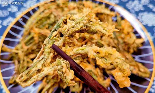 2.熱鍋燒油,將香椿放入面糊中,蘸一下,使其裹上一層面糊,然後放入油鍋內,小火慢炸,將香椿炸至泛黃後,撈出,繼續給油加熱,冒青煙後,放入香椿,復炸15秒,然後取出,即可食用。
