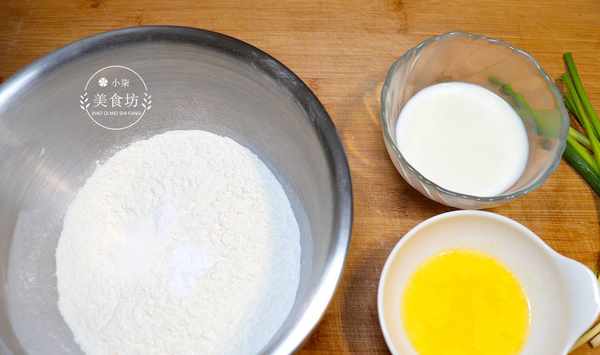 第一步:準備好所有食材。首先把150克底筋面粉放入盆裡,沒有底筋面粉也可以用蒸饅頭包子的面粉,區別不是太大,面粉裡加入2克鹽,1克小蘇打。純牛奶加溫熱放入2克酵母化開,黃油也加熱化開,細蔥洗凈切成蔥花。