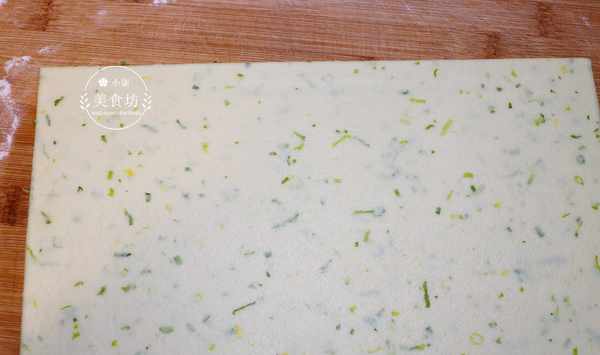 第六步:半個小時後,面團會稍微發酵大一些,取出放案板上揉幾次排出面裡面的氣體,然後用搟面杖搟成薄一點的大面餅,把多餘的不規則邊角去掉,最後切成這樣的長方形即可,厚度大約2毫米左右。太厚烤的不酥脆。