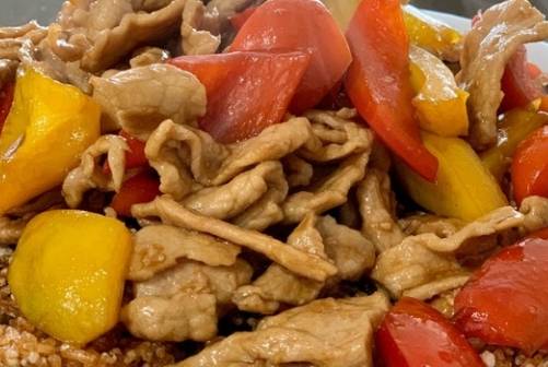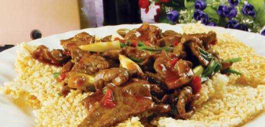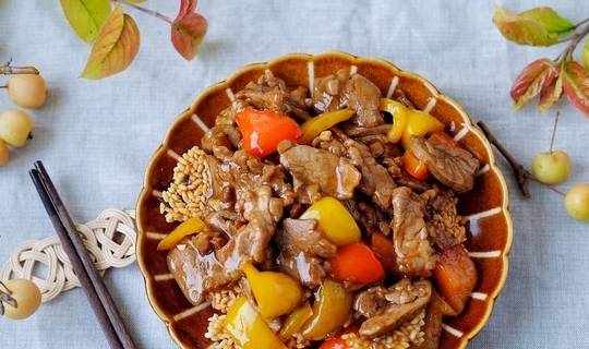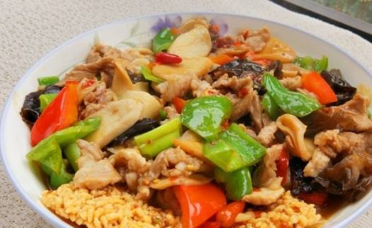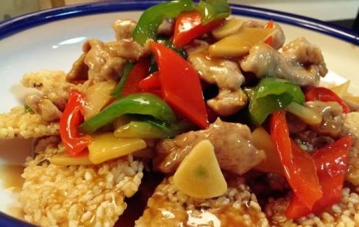 再加一點油,放剩下的蔥薑蒜末,炒出香味後下菜椒,翻炒一會再下肉片,把調好的醬汁也放進去。等肉片炒到差不多的時候,加一點水淀粉勾芡,再炒幾下就可以出鍋瞭。把炸好的鍋巴捏成碎片鋪在盤底,上邊蓋一層肉片和醬汁。如果想要最後的湯汁多一些,中途可以多加一些清水,關火的時候要等湯汁濃稠後再關火,如果加水太多,彩椒會被煮得軟趴趴,視覺上會差很多。