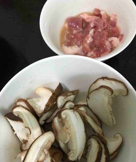 2.香菇切片,肉切片,肉可以用蠔油拌一下