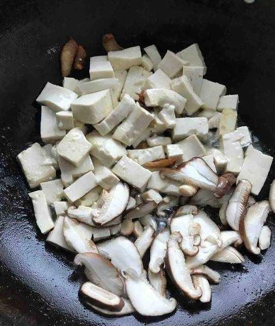 3.鍋底放油七分熱放蒜片爆香,再放豆腐加鹽稍煎一下,放一邊或盛出都可,然後放入香菇炒出香味,加入蓋過食材的水燜煮,煮開後倒入肉片煮熟後放入蔥花即可。